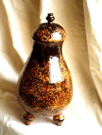 Bote, Elaborado en el torno. Decoración por salpicado en varios tonos de marrón crema. Esmaltado con brillo.
